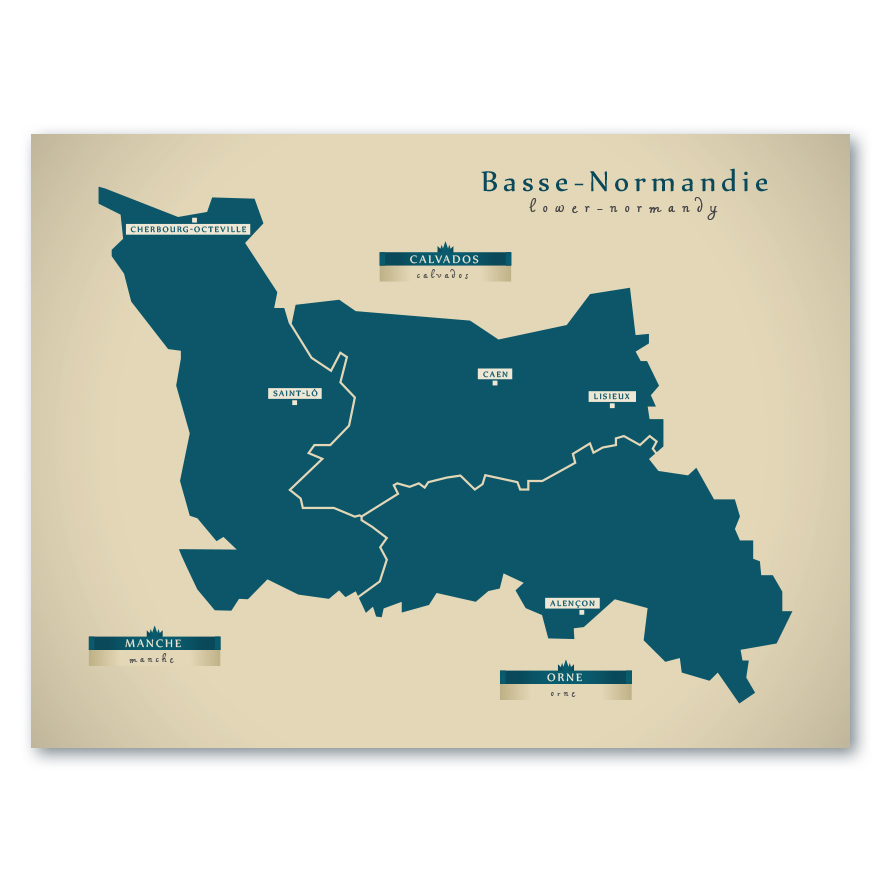 Eine moderne Karte von Basse-Normandie. Mit petrol-grüner Farbe auf ockerfarbenen Hintergrund erscheint sie klassisch und modern sowie zeitlos zugleich. Ein echter Blickfang an der Wand.