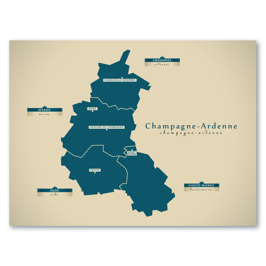 Eine moderne Karte von Champagne-Ardenne. Mit petrol-grüner Farbe auf ockerfarbenen Hintergrund erscheint sie klassisch und modern sowie zeitlos zugleich. Ein echter Blickfang an der Wand.
