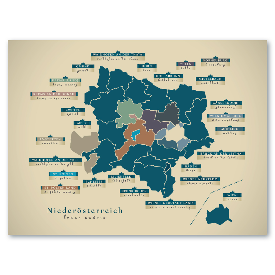 Eine moderne Karte von Niederösterreich. Mit petrol-grüner Farbe auf ockerfarbenen Hintergrund erscheint sie klassisch und modern sowie zeitlos zugleich. Ein echter Blickfang an der Wand.
