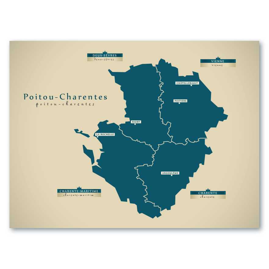 Poitou-Charentes Karte (Frankreich) – Moderne Landkarte – Wandbild Kunstdruck Poster Map